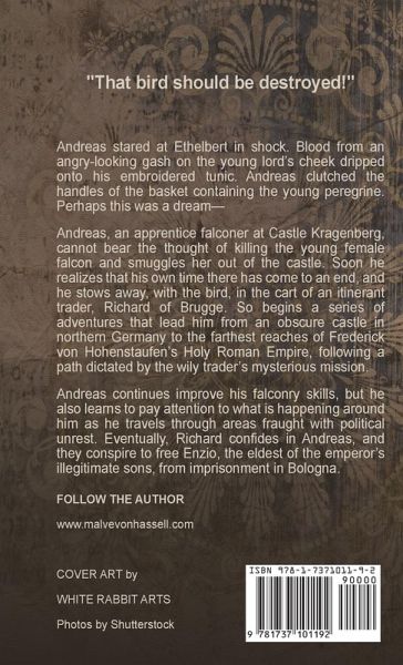 "That bird should be destroyed!" Andreas stared at Ethelbert in shock. Blood from an angry-looking gash on the young lord's cheek dripped onto his embroidered tunic. Andreas clutched the handles of the basket containing the young peregrine. Perhaps this was a dream- Andreas, an apprentice falconer at Castle Kragenberg, cannot bear the thought of killing the young female falcon and smuggles her out of the castle. Soon he realizes that his own time there has come to an end, and he stows away, with the bird, in the cart of an itinerant trader, Richard of Brugge. So begins a series of adventures that lead him from an obscure castle in northern Germany to the farthest reaches of Frederick von Hohenstaufen's Holy Roman Empire, following a path dictated by the wily trader's mysterious mission. Andreas continues improve his falconry skills, but he also learns to pay attention to what is happening around him as he travels through areas fraught with political unrest. Eventually, Richard confides in Andreas, and they conspire to free Enzio, the eldest of the emperor's illegitimate sons, from imprisonment in Bologna.