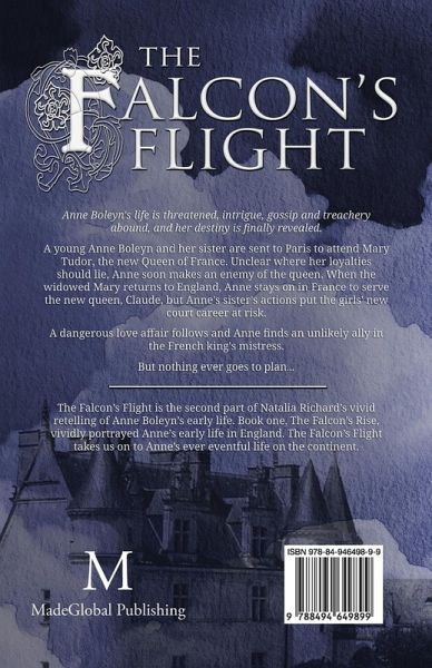 Anne Boleyn's life is threatened, intrigue, gossip and treachery abound, and her destiny is finally revealed. A young Anne Boleyn and her sister are sent to Paris to attend Mary Tudor, the new Queen of France. Unclear where her loyalties should lie, Anne soon makes an enemy of the queen. When the widowed Mary returns to England, Anne stays on in France to serve the new queen, Claude, but Anne's sister's actions put the girls' new court career at risk. A dangerous love affair follows and Anne finds an unlikely ally in the French king's mistress. But nothing ever goes to plan... --------------- The Falcon’s Flight is the second part of Natalia Richard’s vivid retelling of Anne Boleyn’s early life. Book one, The Falcon’s Rise, vividly portrayed Anne’s early life in England. The Falcon’s Flight takes us on to Anne’s ever eventful life on the continent. Natalia Richards does it again with this novel - Claire Ridgway, author and historian