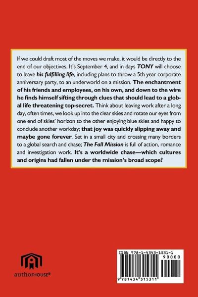 If we could draft most of the moves we make, it would be directly to our objective's end. It's September 4, and in days, Tony will choose to leave familiar living conditions including his plans to throw a 5th year corporate anniversary party to an underworld on a mission. The enchantment of his friends and employees, on his own and down to the wire, he finds himself sifting through clues that should lead to a global life threatening top secret. When leaving work, often times we look up into the clear skies, circling our eyes from one end of skies' far horizon to the other, enjoying blue skies, happy to conclude another workday. That joy was quickly slipping away and maybe gone forever. Set in a small city setting and crossing many borders to a global search and chase. The Fall Mission is an action and adventure story filled with romance, investigation work, foresight, and even teratology (the study of monsters). A worldwide chase, see if your culture and/or origin falls under the mission's broad scope.