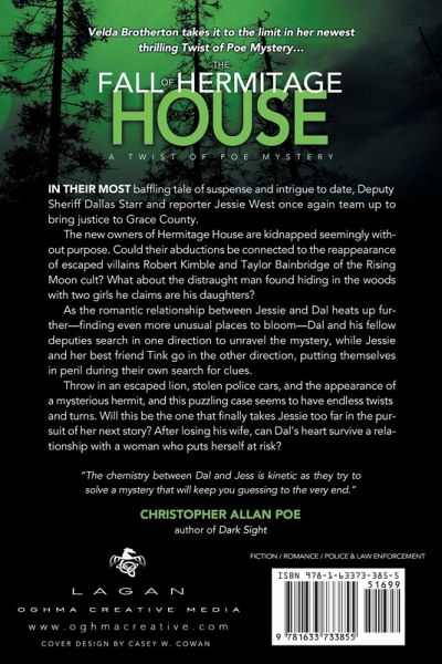 Velda Brotherton takes it to the limit in her newest Twist of Poe Mystery... THE FALL OF HERMITAGE HOUSE. In their most baffling tale of suspense and intrigue to date, Deputy Sheriff Dallas Starr and reporter Jessie West once again team up to bring justice to Grace County. The new owners of Hermitage House are kidnapped seemingly without purpose. Could their abductions be connected to the reappearance of escaped villains Robert Kimble and Taylor Bainbridge of the Rising Moon cult? What about the distraught man found hiding in the woods with two girls he claims are his daughters? As the romantic relationship between Jessie and Dal heats up further-finding even more unusual places to bloom-Dal and his fellow deputies search in one direction to unravel the mystery, while Jessie and her best friend Tink go in the other direction, putting themselves in peril during their own search for clues. Throw in an escaped lion, stolen police cars, and the appearance of a mysterious hermit, and this puzzling case seems to have endless twists and turns. Will this be the one that finally takes Jessie too far in the pursuit of her next story? After losing his wife, can Dal's heart survive a relationship with a woman who puts herself at risk?