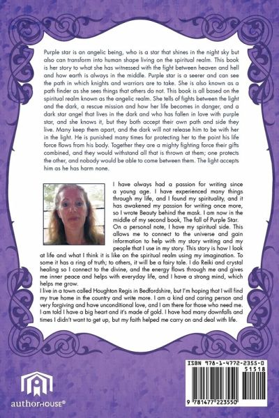 Purple star is an angelic being, who is a star that shines in the night sky but also can transform into human shape living on the spiritual realm. This book is her story to what she has witnessed with the fight between heaven and hell and how earth is always in the middle. Purple star is a seerer and can see the path in which knights and warriors are to take. She is also known as a path finder as she sees things that others do not. This book is all based on the spiritual realm known as the angelic realm. She tells of fights between the light and the dark, a rescue mission and how her life becomes in danger, and a dark star angel that lives in the dark and who has fallen in love with purple star, and she knows it, but they both accept their own path and side they live. Many keep them apart, and the dark will not release him to be with her in the light. He is punished many times for protecting her to the point his life force flows from his body. Together they are a mighty fighting force their gifts combined, and they would withstand all that is thrown at them; one protects the other, and nobody would be able to come between them. The light accepts him as he has harm none.
