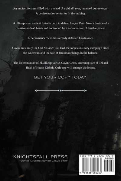 An ancient fortress filled with undead. An old alliance, renewed but untested. A confrontation centuries in the making. Skullkeep is an ancient fortress built to defend Hope's Pass. Now a bastion of a massive undead horde and controlled by a necromancer of terrible power. A necromancer who has already defeated Gavin once. Gavin must rally the Old Alliance and lead the largest military campaign since the Godswar, and the fate of Drakmoor hangs in the balance. The Necromancer of Skullkeep versus Gavin Cross, Archmagister of Tel and Head of House Kirloth. Only one will emerge victorious. Get your copy today!