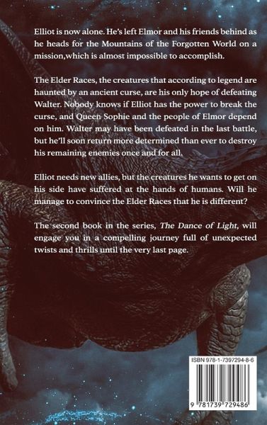 Elliot is now alone. He's left Elmor and his friends behind as he heads for the Mountains of the Forgotten World on a mission, which is almost impossible to accomplish. The Elder Races, the creatures that according to legend are haunted by an ancient curse, are his only hope of defeating Walter. Nobody knows if Elliot has the power to break the curse, and Queen Sophie and the people of Elmor depend on him. Walter may have been defeated in the last battle, but he'll soon return more determined than ever to destroy his remaining enemies once and for all. Elliot needs new allies, but the creatures he wants to get on his side have suffered at the hands of humans. Will he manage to convince the Elder Races that he is different? The second book in the series, The Dance of Light, will engage you in a compelling journey full of unexpected twists and thrills until the very last page.