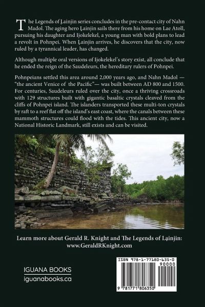 The Legends of Lainjin series concludes in the pre-contact city of Nahn Madol. The aging hero Lainjin sails there from his home on Lae Atoll, pursuing his daughter and Ijokelekel, a young man with bold plans to lead a revolt in Pohnpei. When Lainjin arrives, he discovers that the city, now ruled by a tyrannical leader, has changed. Although multiple oral versions of Ijokelekel's story exist, all conclude that he ended the reign of the Saudeleurs, the hereditary rulers of Pohnpei. Pohnpeians settled this area around 2,000 years ago, and Nahn Madol -"the ancient Venice of the Pacific"- was built between AD 800 and 1500. For centuries, Saudeleurs ruled over the city, once a thriving crossroads with 129 structures built with gigantic basaltic crystals cleaved from the cliffs of Pohnpei island. The islanders transported these multi-ton crystals by raft to a reef flat off the island's east coast, where the canals between these mammoth structures could flood with the tides. This ancient city, now a National Historic Landmark, still exists and can be visited.
