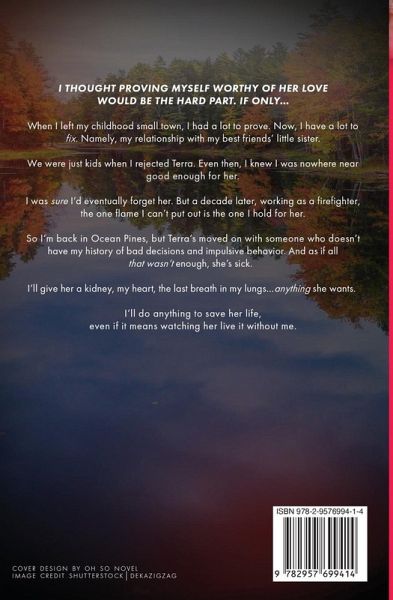 I thought proving myself worthy of her love would be the hard part. If only... When I left my childhood small town, I had a lot to prove. Now, I have a lot to fix. Namely, my relationship with my best friends' little sister. We were just kids when I rejected Terra. Even then, I knew I was nowhere near good enough for her. I was sure I'd eventually forget her. But a decade later, working as a firefighter, the one flame I can't put out is the one I hold for her. So I'm back in Ocean Pines, but Terra's moved on with someone who doesn't have my history of bad decisions and impulsive behavior. And as if all that wasn't enough, she's sick. I'll give her a kidney, my heart, the last breath in my lungs...anything she wants. ¿I'll do anything to save her life, even if it means watching her live it without me.
