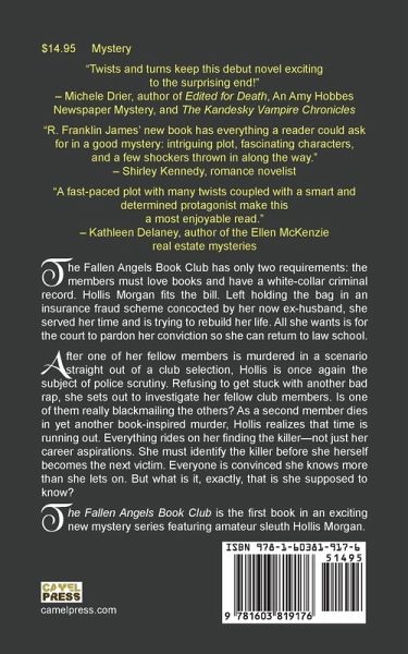 The Fallen Angels Book Club has only two requirements: the members must love books and have a white-collar criminal record. Hollis Morgan fits the bill. Left holding the bag in an insurance fraud scheme concocted by her now ex-husband, she served her time and is trying to rebuild her life. All she wants is for the court to pardon her conviction so she can return to law school. After one of her fellow members is murdered in a scenario straight out of a club selection, Hollis is once again the subject of police scrutiny. Refusing to get stuck with another bad rap, she sets out to investigate her fellow club members. Is one of them really blackmailing the others? As a second member dies in yet another book-inspired murder, Hollis realizes that time is running out. Everything rides on her finding the killer-not just her career aspirations. She must identify the killer before she herself becomes the next victim. Everyone is convinced she knows more than she lets on. But what is it, exactly, that is she supposed to know? The Fallen Angels Book Club is the first book in an exciting new mystery series featuring amateur sleuth Hollis Morgan.