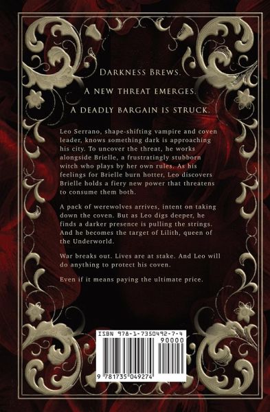 Darkness brews. A new threat emerges. A deadly bargain is struck. Leo Serrano, shape-shifting vampire and coven leader, knows something dark is approaching his city. To uncover the threat, he works alongside Brielle, a frustratingly stubborn witch who plays by her own rules. As his feelings for Brielle burn hotter, Leo discovers Brielle holds a fiery new power that threatens to consume them both. A pack of werewolves arrives, intent on taking down the coven. But as Leo digs deeper, he finds a darker presence is pulling the strings. And he becomes the target of Lilith, queen of the Underworld. War breaks out. Lives are at stake. And Leo will do anything to protect his coven. Even if it means paying the ultimate price.