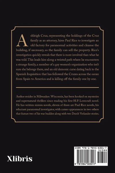 Ashleigh Cruz, representing the holdings of the Cruz family as an attorney, hires Paul Rice to investigate an old factory for paranormal activities and cleanse the building, if necessary, so the family can sell the property. Rice's investigation quickly reveals that there is more involved than what he was told. This leads him along a twisted path where he encounters a strange family, a member of a gay women's organization who isn't sure she belongs there, and an old demonic curse dating back to the Spanish Inquisition that has followed the Cruzes across the ocean from Spain to America and is killing off the family one by one.…mehr