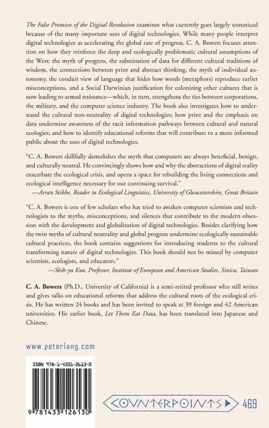 «No one has taught me more about the link between the ecological crisis and education than C. A. Bowers. When so many educators regarded computers as the newest pedagogical savior, Bowers was asking the hard questions. Bowers continues to peel away the shiny packaging of 'progress' and the myths of the new digital age. I'm delighted that Bowers is still challenging us to evaluate the 'false promises of the digital revolution.' We need this analysis now more than ever.» (Bill Bigelow, Editor, 'Rethinking Schools')