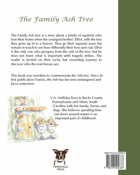 The Family Ash Tree is a story about a family of squirrels who lose their home when the youngest brother, Elliot, sells the tree they grew up in to a beaver. They go their separate ways but remain in touch to see how differently their lives turn out. Elliot is the only one who prospers from the sale of the tree, but he does not learn what is important until tragedy strikes. The reader is invited on their rocky but rewarding journey to discover who the real heroes are. This book was rewritten to commemorate the Ash tree. Since its first publication Franxis, the Ash has become endangered and faces extinction. V.A. Halliday lives in Bucks County, Pennsylvania and Aiken, South Carolina with her family, horses and dogs. She believes spending time outdoors around nature is an important part of childhood.