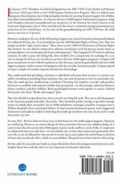 In January 1975, President Gerald Ford signed into law HR 17045 of the Health and Human Services, which gave birth to the Child Support Enforcement Program. This is a federal-state program whose purpose was to help strengthen families by securing financial support for children from their noncustodial parents. As a bonus, this new Child Support Enforcement program, along with President Johnson's unconditional war on poverty in the America Act, better known as the Economic Opportunity Act of 1964, was sold to be the answer to eliminate intergenerational poverty cycles here in the United States. At the time of this groundbreaking new HR 17045 law, the child poverty rate was at 12 percent. However, standing in the way of this bill passing Congress was a heavily favored constitutional bedrock law called the Privacy Act. At its foundation was the 1890 Brandeis Right to Privacy law. That was simply stated the "right to be let alone." Then, there was the 1948 UN Declaration of Human Rights that declares "no one shall be subjected to arbitrary interference with his privacy, family, home or correspondence; nor attacks upon his honor and reputation." The Congress of 1974 was in a decisive moment. In order to pass this failing bill, there needed to be a compromise. In exchange for a yes vote to change the Privacy Act (so that we can have this new child support program), Congress will grant exemptions to some federal employees so that their pay cannot be garnished by this new child support program. And to cement this program with the everyday American people, Congress agreed to input a couple of stimulus-response theories into this package. They understood that providing a stimulus to individuals will cause them to react in a certain way, and by rewarding or punishing these responses, they can train the person to react in a particular way. They also used operant conditioning, a method of learning that employs, rewards, and punishes behaviors to establish and maintain conflict between parties--in this example, behaviors between fathers, mothers, and their children. Both psychological theories work together to ensure a desired destination: the classic "divide and conquer" plan. Now that this bill was signed into law, there was only one thing left to do. That was to sell this program to the American people and collect the profits. They found the perfect strategy to get their message across: it's called yellow journalism. It's an 1890s melodrama technique, coined by newspaper owners William Randolph Hearst and Joseph Pulitzer. It used sensational dramatic pieces, with exaggerated characters to persuade its readers to believing that made-up storylines were true. In the end, it made them both very rich. It's now 2021. We have had over forty years to look back over this child support program. Opinions are conflicting. However, we cannot change the facts; remember, facts are very stubborn things. It is a proven fact that this system (the child support system) needs conflict to work. Folks, it's important to understand what is at stake here--it's your family tree. At least three consecutive generations after you will, or can, be affected by what you do. It is now up to you to plant the seed of hope in the lives of those who you directly affect, which are your children. The good news is that God saw this coming. He has a plan for you and your family to escape (break free) from this intergenerational poverty cycle. Insights about how and why this is so very important are shared in this book.