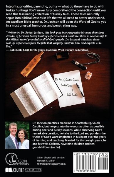 Integrity, priorities, parenting, purity - what do these have to do with turkey hunting? You'll never fully comprehend the connection until you read this fascinating collection of turkey tales. These tales naturally segue into biblical lessons in life that we all need to better understand. An excellent Bible teacher, Dr. Jackson will open the Word of God to you in a most unusual, humorous and penetrating way. Dr. Jackson practices medicine in Spartanburg, South Carolina, but he gets into the woods as often as possible during deer and turkey seasons. While observing God's remarkable creation, he talks to the Lord and ponders the truths of God's Word implanted in his heart over the years of learning and teaching. Married for thirty-eight years, he and his wife, Carlotta, have nine children and ten grandchildren (so far).