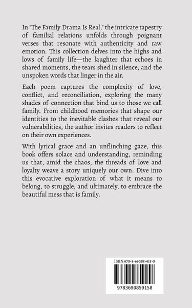 In "The Family Drama Is Real," the intricate tapestry of familial relations unfolds through poignant verses that resonate with authenticity and raw emotion. This collection delves into the highs and lows of family life-the laughter that echoes in shared moments, the tears shed in silence, and the unspoken words that linger in the air. Each poem captures the complexity of love, conflict, and reconciliation, exploring the many shades of connection that bind us to those we call family. From childhood memories that shape our identities to the inevitable clashes that reveal our vulnerabilities, the author invites readers to reflect on their own experiences. With lyrical grace and an unflinching gaze, this book offers solace and understanding, reminding us that, amid the chaos, the threads of love and loyalty weave a story uniquely our own. Dive into this evocative exploration of what it means to belong, to struggle, and ultimately, to embrace the beautiful mess that is family.