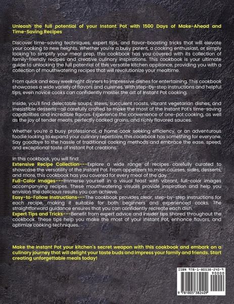 Unleash the full potential of your Instant Pot with 1500 Days of Make-Ahead and Time-Saving Recipes Discover time-saving techniques, expert tips, and flavor-boosting tricks that will elevate your cooking to new heights. Whether you're a busy parent, a cooking enthusiast, or simply looking to simplify your meal prep, this cookbook has you covered with its collection of family-friendly recipes and creative culinary inspirations. This cookbook is your ultimate guide to unlocking the full potential of this versatile kitchen appliance, providing you with a collection of mouthwatering recipes that will revolutionize your mealtime. From quick and easy weeknight dinners to impressive dishes for entertaining, This cookbook showcases a wide variety of flavors and cuisines. With step-by-step instructions and helpful tips, even novice cooks can confidently master the art of Instant Pot cooking. Inside, you'll find delectable soups, stews, succulent roasts, vibrant vegetarian dishes, and irresistible desserts-all carefully crafted to make the most of the Instant Pot's time-saving capabilities and incredible flavors. Experience the convenience of one-pot cooking, as well as the joy of tender meats, perfectly cooked grains, and richly flavored sauces. Whether you're a busy professional, a home cook seeking efficiency, or an adventurous foodie looking to expand your culinary repertoire, this cookbook has something for everyone. Say goodbye to the hassle of traditional cooking methods and embrace the ease, speed, and exceptional taste of Instant Pot creations. In this cookbook, you will find:Extensive Recipe Collection---Explore a wide range of recipes carefully curated to showcase the versatility of the Instant Pot. From appetizers to main courses, sides, desserts, and more, this cookbook has you covered for every meal of the day.Full-Color Images---Immerse yourself in a visual feast with vibrant, full-color images accompanying recipes. These mouthwatering visuals provide inspiration and help you envision the delicious results you can achieve.Easy-to-Follow Instructions---The cookbook provides clear, step-by-step instructions for each recipe, making it suitable for both beginners and experienced cooks. The straightforward guidance ensures that you can confidently recreate each dish.Expert Tips and Tricks---Benefit from expert advice and insider tips shared throughout the cookbook. These tips help you make the most of your Instant Pot, enhance flavors, and optimize cooking techniques. Make the Instant Pot your kitchen's secret weapon with this cookbook and embark on a culinary journey that will delight your taste buds and impress your family and friends. Start creating unforgettable meals today!