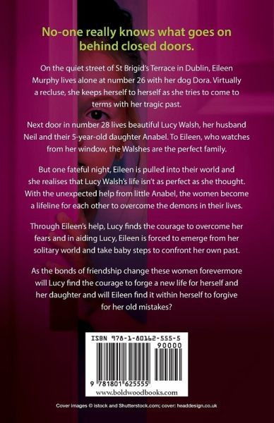 No one really knows what goes on behind closed doors. On the quiet street of St Brigid's Terrace in Dublin, Eileen Murphy lives alone at number 26 with her dog Dora. Virtually a recluse, she keeps herself to herself as she tries to come to terms with her tragic past. Next door in number 28 lives beautiful Lucy Walsh, her husband Neil and their 5-year-old daughter Anabel. To Eileen, who watches from her window, the Walshs are the perfect family. But one fateful night, Eileen is pulled into their world and she realises that Lucy Walshs life isn't as perfect as she thought. With the unexpected help from little Anabel, the women become a lifeline for each other to overcome the demons in their lives. Through Eileen's help, Lucy finds the courage to overcome her fears and in aiding Lucy, Eileen is forced to emerge from her solitary world and take baby steps to confront her own past. As the bonds of friendship change these women forevermore will Lucy find the courage to forge a new life for herself and her daughter and will Eileen find it within herself to forgive for her old mistakes?