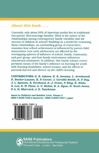 Series Editor s Introduction - Thomas P Gullotta It Is in Our Best Interest PART ONE: PROCESSES The Family-School Relationships Model - Bruce A Ryan and Gerald R Adams Inquiring into Children s Social Worlds - Ellen S Amatea and Peter A D Sherrard A Choice of Lenses Parent-Child Interactions and School Achievement - Diane Scott-Jones National Patterns of School and Family Connections in the Middle Grades - Joyce L Epstein and Seyong Lee The Impact of Family Environment on Educational Attainment - Jay D Teachman, Randal D Day and Karen Price Carver Do Families Make a Difference? PART TWO: ISSUES High Achievement, Underachievement and Learning Disabilities - Robert-Jay Green A Family Systems Model Children s School Performance - Rex Forehand, Lisa Armistead and Karla Klein The Roles of Interparental Conflict and Divorce Truancy, Family Processes, and Interventions - Jane Corville-Smith The Family Resource Center - Robert W Plant and Patricia A King A Community-Based System of Family Support Services Intergenerational Influences on Child Outcomes - Annette U Rickel and Evvie Becker-Lausen Implications for Prevention and Intervention