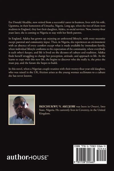 Eze Donald Akudike, now retired from a successful career in business, lives with his wife, Ugomma, in their hometown of Umuoha, Nigeria. Long ago, when the two of them were students in England, they lost their daughter, Adaku, to social services. Now, twenty-four years later, she is coming to Nigeria to stay with her birth parents. In England, Adaku has grown up enjoying an unfettered lifestyle, with every necessity except parental and community input. Then, in Nigeria, she experiences an environment with an absence of every comfort except what is made available by immediate family, where individual lifestyle conforms to the expectation of the community, where everybody is each other's keeper, and life is lived on the dictates of culture and tradition. Adaku finds herself struggling to change her perception, attitude, and approach to life. As she learns to cope with this new life, she begins to discover who she really is, the price she must pay, and the future she hopes to build. In this novel, when a Nigerian couple reunites with their twenty-four-year-old daughter, who was raised in the UK, friction arises as the young woman acclimates to a culture she has never known.