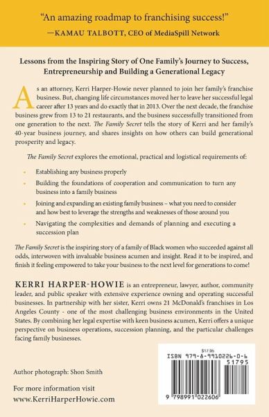 Lessons from the Inspiring Story of One Family's Journey to Success, Entrepreneurship and Building a Generational Legacy As an attorney, Kerri Harper-Howie never planned to join her family's franchise business. But, changing life circumstances moved her to leave her successful legal career after 13 years and do exactly that in 2013. Over the next decade, the franchise business grew from 13 to 21 restaurants, and the business successfully transitioned from one generation to the next. The Family Secret tells the story of Kerri and her family's 40-year business journey, and shares insights on how others can build generational prosperity and legacy. The Family Secret explores the emotional, practical and logistical requirements of:Establishing any business properly Building the foundations of cooperation and communication to turn any business into a family business Joining and expanding an existing family business - what you need to consider and how best to leverage the strengths and weaknesses of those around you Navigating the complexities and demands of planning and executing a succession plan The Family Secret is the inspiring story of a family of Black women who succeeded against all odds, interwoven with invaluable business acumen and insight. Read it to be inspired, and finish it feeling empowered to take your business to the next level for generations to come!