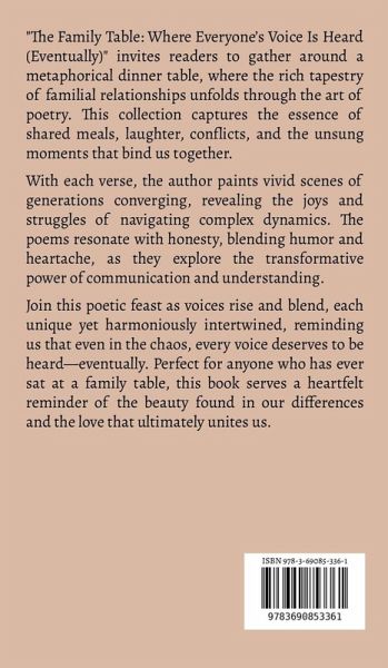 "The Family Table: Where Everyone's Voice Is Heard (Eventually)" invites readers to gather around a metaphorical dinner table, where the rich tapestry of familial relationships unfolds through the art of poetry. This collection captures the essence of shared meals, laughter, conflicts, and the unsung moments that bind us together. With each verse, the author paints vivid scenes of generations converging, revealing the joys and struggles of navigating complex dynamics. The poems resonate with honesty, blending humor and heartache, as they explore the transformative power of communication and understanding. Join this poetic feast as voices rise and blend, each unique yet harmoniously intertwined, reminding us that even in the chaos, every voice deserves to be heard-eventually. Perfect for anyone who has ever sat at a family table, this book serves a heartfelt reminder of the beauty found in our differences and the love that ultimately unites us.