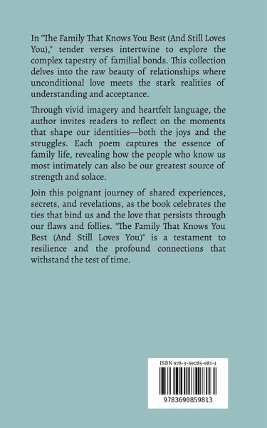 In "The Family That Knows You Best (And Still Loves You)," tender verses intertwine to explore the complex tapestry of familial bonds. This collection delves into the raw beauty of relationships where unconditional love meets the stark realities of understanding and acceptance. Through vivid imagery and heartfelt language, the author invites readers to reflect on the moments that shape our identities-both the joys and the struggles. Each poem captures the essence of family life, revealing how the people who know us most intimately can also be our greatest source of strength and solace. Join this poignant journey of shared experiences, secrets, and revelations, as the book celebrates the ties that bind us and the love that persists through our flaws and follies. "The Family That Knows You Best (And Still Loves You)" is a testament to resilience and the profound connections that withstand the test of time.