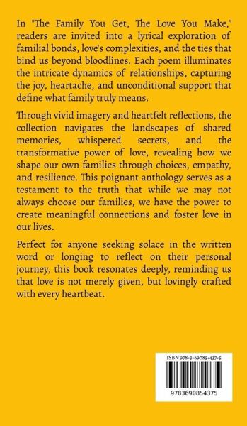 In "The Family You Get, The Love You Make," readers are invited into a lyrical exploration of familial bonds, love's complexities, and the ties that bind us beyond bloodlines. Each poem illuminates the intricate dynamics of relationships, capturing the joy, heartache, and unconditional support that define what family truly means. Through vivid imagery and heartfelt reflections, the collection navigates the landscapes of shared memories, whispered secrets, and the transformative power of love, revealing how we shape our own families through choices, empathy, and resilience. This poignant anthology serves as a testament to the truth that while we may not always choose our families, we have the power to create meaningful connections and foster love in our lives. Perfect for anyone seeking solace in the written word or longing to reflect on their personal journey, this book resonates deeply, reminding us that love is not merely given, but lovingly crafted with every heartbeat.