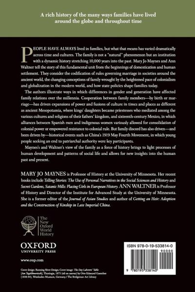 People have always lived in families, but what that means has varied dramatically across time and cultures. The family is not a "natural" phenomenon but an institution with a dynamic history stretching 10,000 years into the past. Mary Jo Maynes and Ann Waltner tell the story of this fundamental unit from the beginnings of domestication and human settlement. They consider the codification of rules governing marriage in societies around the ancient world, the changing conceptions of family wrought by the heightened pace of colonialism and globalization in the modern world, and how state policies shape families today. The authors illustrate ways in which differences in gender and generation have affected family relations over the millennia. Cooperation between family members--by birth or marriage--has driven expansions of power and fusions of culture in times and places as different as ancient Mesopotamia, where kings' daughters became priestesses who mediated among the various cultures and religions of their fathers' kingdom, and sixteenth-century Mexico, in which alliances between Spanish men and indigenous women variously allowed for consolidation of colonial power or empowered resistance to colonial rule. But family discord has also driven - and been driven by - historical events such as China's 1919 May Fourth Movement, in which young people seeking an end to patriarchal authority were key participants. Maynes's and Waltner's view of the family as a force of history brings to light processes of human development and patterns of social life and allows for new insights into the human past and present.