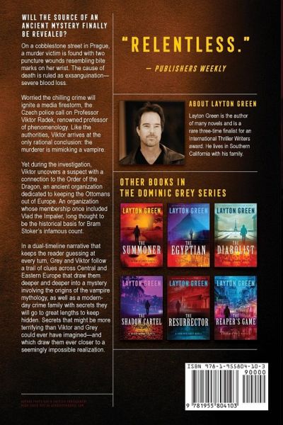 Will the source of an ancient mystery finally be revealed? On a cobblestone street in Prague, a murder victim is found with two puncture wounds resembling bite marks on her wrist. The cause of death is ruled as exsanguination-severe blood loss. Worried the chilling crime will ignite a media firestorm, the Czech police call on Professor Viktor Radek, renowned professor of phenomenology. Like the authorities, Viktor arrives at the only rational conclusion: the murderer is mimicking a vampire. Yet during the investigation, Viktor uncovers a suspect with a connection to the Order of the Dragon, an ancient organization dedicated to keeping the Ottomans out of Europe. An organization whose membership once included Vlad the Impaler, long thought to be the historical basis for Bram Stoker's infamous count. In a dual-timeline narrative that keeps the reader guessing at every turn, Grey and Viktor follow a trail of clues across Central and Eastern Europe that draw them deeper and deeper into a mystery involving the origins of the vampire mythology, as well as a modern-day crime family with secrets they will go to great lengths to keep hidden. Secrets that might be more terrifying than Viktor and Grey could ever have imagined-and which draw them ever closer to a seemingly impossible realization.