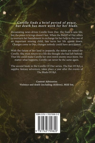 Corelle finds a brief period of peace, but death has more work for her blade. Devastating news drives Corelle from Dur. She finds a new life, but the peace it brings doesn't last. When the Bailiff of Dur offers to overturn her banishment in exchange for her help in the case of an important missing child, fate turns her life upside down. Changes come to Dur, changes nobody could have anticipated. With the future of her land in jeopardy, the stakes are raised for Corelle. She must return to a life she thought she had left behind. That life could make Corelle her own worst enemy once more. No matter what happens, Corelle can never be the same again. The second book in the Corelle Of Dur series, The Fan Of Ryl, a sapphic fantasy adventure, takes place a year after the events of The Blade Of Ryl. Content Advisory - Violence and death (including children), Mild Sex
