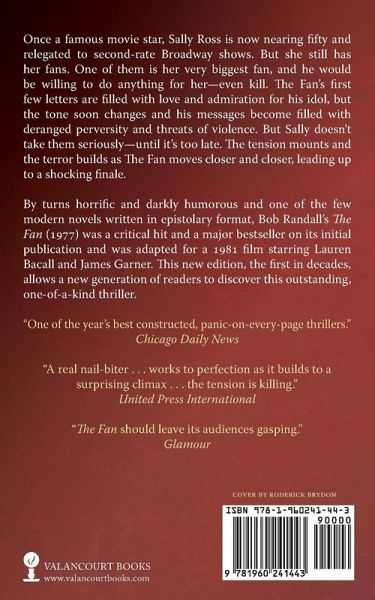 Once a famous movie star, Sally Ross is now nearing fifty and relegated to second-rate Broadway shows. But she still has her fans. One of them is her very biggest fan, and he would be willing to do anything for her - even kill. The Fan's first few letters are filled with love and admiration for his idol, but the tone soon changes and his messages become filled with deranged perversity and threats of violence. But Sally doesn't take them seriously - until it's too late. The tension mounts and the terror builds as The Fan moves closer and closer, leading up to a shocking finale. By turns horrific and darkly humorous and one of the few modern novels written in epistolary format, Bob Randall's The Fan (1977) was a critical hit and a major bestseller on its initial publication and was adapted for a 1981 film starring Lauren Bacall and James Garner. This new edition, the first in decades, allows a new generation of readers to discover this outstanding, one-of-a-kind thriller."A virtuoso performance in suspense, full of menace and the threat of violence." - Los Angeles Times"One of the year's best constructed, panic-on-every-page thrillers." - Chicago Daily News"A real nail-biter ... works to perfection as it builds to a surprising climax ... the tension is killing." - UPI"Splendidly unnerving." - Saturday Review"Grotesque, funny, shocking tour de force ... The suspense increases and the ending is horrible. Fan-tastic." - Irish Times"The Fan should leave its audiences gasping." - Glamour"An essay in terror that creeps up as softly as a mugger wearing sneakers ... almost unbearable." - Cosmopolitan