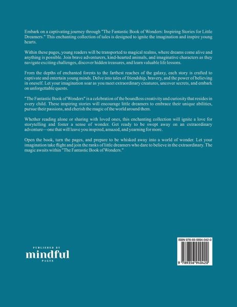 Embark on a captivating journey through "The Fantastic Book of Wonders: Inspiring Stories for Little Dreamers." This enchanting collection of tales is designed to ignite the imagination and inspire young hearts. Within these pages, young readers will be transported to magical realms, where dreams come alive and anything is possible. Join brave adventurers, kind-hearted animals, and imaginative characters as they navigate exciting challenges, discover hidden treasures, and learn valuable life lessons. From the depths of enchanted forests to the farthest reaches of the galaxy, each story is crafted to captivate and entertain young minds. Delve into tales of friendship, bravery, and the power of believing in oneself. Let your imagination soar as you meet extraordinary creatures, uncover secrets, and embark on unforgettable quests. "The Fantastic Book of Wonders" is a celebration of the boundless creativity and curiosity that resides in every child. These inspiring stories will encourage little dreamers to embrace their unique abilities, pursue their passions, and cherish the magic of the world around them. Whether reading alone or sharing with loved ones, this enchanting collection will ignite a love for storytelling and foster a sense of wonder. Get ready to be swept away on an extraordinary adventure-one that will leave you inspired, amazed, and yearning for more. Open the book, turn the pages, and prepare to be whisked away into a world of wonder. Let your imagination take flight and join the ranks of little dreamers who dare to believe in the extraordinary. The magic awaits within "The Fantastic Book of Wonders."