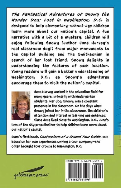 The Fantastical Adventures of Snowy the Wonder Dog: Lost in Washington, D.C. is designed to help elementary-school-age children learn more about our nation's capital. A fun narrative with a bit of a mystery, children will enjoy following Snowy (author June Harvey's real classroom dog!) from major monuments to the Capitol Building and The Smithsonian in search of her lost friend. Snowy delights in understanding the features of each location. Young readers will gain a better understanding of Washington, D.C., as Snowy's adventures encourage them to visit the nation's capital.