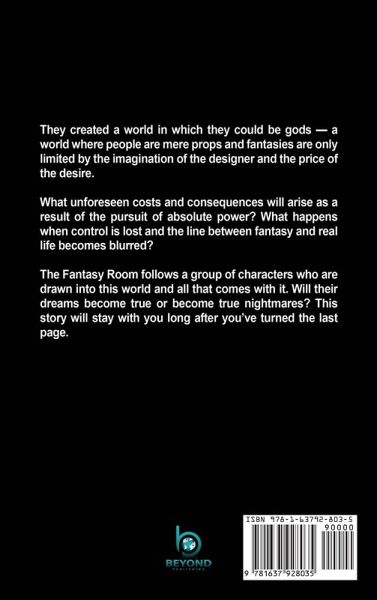 They created a world in which they could be gods - a world where people are mere props and fantasies are only limited by the imagination of the price of the designer and the price of the desire. What unforseen costs and consequences will arise as a result of the pursuit of absolute power? What happens when control is lost and the line between fantasy and real life becomes blurred? The Fantasy Room follows a group of characters who are drawn into this world and all that comes with it. Will their dreams become true or become true nightmares? This story will stay with you long after you've turned the last page.