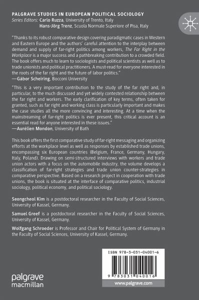 This book offers the first comparative study of far-right messaging and organizing efforts at the workplace level as well as responses by established trade unions, encompassing six European countries (Belgium, France, Germany, Hungary, Italy, Poland). Drawing on semi-structured interviews with workers and trade union actors with a focus on the automobile industry, the volume develops a classification of far-right strategies and trade union counter-strategies in comparative perspective. Based on a research project in cooperation with trade unions, the book is situated at the interface of comparative politics, industrial sociology, political economy, and political sociology.