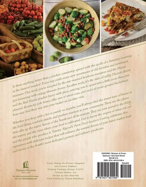 Is there anything better than a kitchen countertop spread with the spoils of a Saturday morning at the farmers' market? Every trip yields some new assortment of old favorites and newfound treasures. Whether you shop with a list or purely on impulse, you'll always find the true taste of home at the local farms, roadside stands, and produce markets in your community. These are the places that offer up the native flavors of the South and all its seasons. They are your portal to the fields, the waters, and the vines where your food is cultivated. Food personality Tammy Algood shares stories of the South's most dedicated growers and culinary producers, and celebrates these experiences with delicious recipes that will enhance the natural flavors of your latest market haul. In Farm Fresh Southern Cooking, you'll find delicious dishes including: Easy Crust Chicken Pot Pie Revival Strawberry Bread Pea-Picking Salsa Sweet Potato and Shrimp Chowder Parnship and Tart Apple Puree Sweet Cherry Dessert Sauce Farm Fresh Southern Cooking is a collection of Tammy's travels across southern states to find locally grown produce, herbs, farms, and farmers' markets. Explore the recipes that Tammy offers to not only tempt your taste buds but also to expand your horizons with new fresh flavors you may not have ever tried.