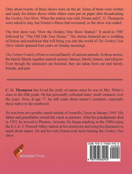 Only about 20 of these shows were on the air. Some of them were written and ready for future shows while others put on paper after broadcasting the Donkey Dan Show. When the station was sold, Donna and C. G. Thompson were asked to stay, but Donna's illness had worsened, so the show was ended. The first show was "How the Donkey Dan Show Started." It aired in 1987 followed by "The Old Oak Tree House." The stories featured are a wedding of fiction and nonfiction that will bring you into the world of The Donkey Dan Show which spanned four years on Sunday mornings. The Farmer Family Album is a mixed family of cartoon animals. In these stories, the family blends together natural science, fantasy, family, humor, and religion. Even though the characters are fictional, they are taken from our real family, friends, and pets.