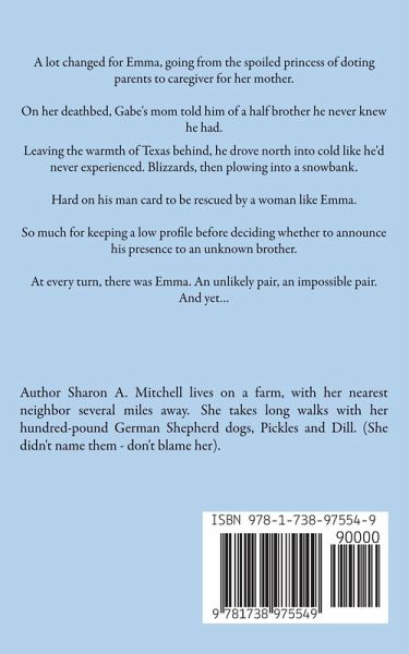 She gave up everything that mattered. He lost all he'd ever believed in. A lot changed for Emma, going from the spoiled princess of doting parents and a promising career, to caregiver for her mother physically, emotionally, and financially. Gabe's life was one of responsibility, the solitary child of a single mom. On her death he learned of the brother he never knew existed. Was it worth packing up and going in search of the only family he had left? Leaving the warmth of Texas behind, he drove north and east into cold like he'd never experienced. Blizzards, then plowing into a snowbank. Hard on his man card to be rescued by a woman - a gorgeous young woman unimpressed with his ability to look after himself, and willing to share her views about him with the locals. So much for keeping a low profile and checking out the situation before deciding whether to announce his presence to an unknown brother. At every turn, there was Emma. An unlikely pair, an impossible pair. And yet… Read this clean and wholesome romance from The Farmers of Goodrich County series.