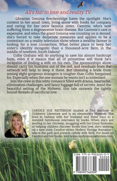 Librarian Gemma Breckenridge hates the spotlight. She's content in her small town, living alone with books for company and caring for her once famous sister, Cammie, who's now suffering from a degenerative brain disease. But Cammie's care is expensive, and when the grant Gemma was counting on is denied, she's forced to take desperate measures and applies to be a contestant on a reality television show where a wealthy farmer is looking for a love connection. What better place to keep her sister's identity incognito than a thousand-acre farm in the middle of nowhere, South Dakota? Colby Graham will do anything to save his almost bankrupt farm, even if it means that all of primetime will think he's incapable of finding a wife on his own. The sponsorships alone should carry his business out of the red, and royalties from the producer will help to keep it there. But choosing a bride from among eight gorgeous strangers is tougher than Colby bargained for. Especially when the one woman he wants isn't a contestant. With a cast of vivid characters, join the crew in this witty romance filled with drama, heartache, elimination challenges, and fancy luggage full of secrets. Amid the beautiful setting of the Midwest, this tale unravels the tightly bound threads of sacrificial love.