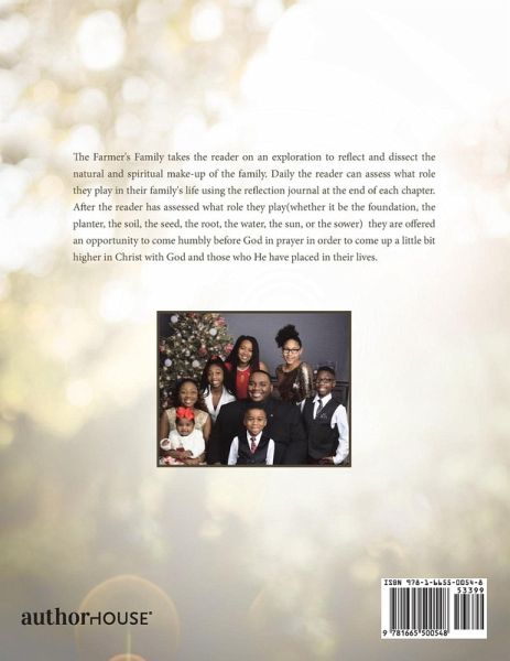 The Farmer's Family takes the reader on an exploration to reflect and dissect the natural and spiritual make-up of the family. Daily the reader can assess what role they play in their family's life using the reflection journal at the end of each chapter. After the reader has assessed what role they play(whether it be the foundation, the planter, the soil, the seed, the root, the water, the sun, or the sower) they are offered an opportunity to come humbly before God in prayer in order to come up a little bit higher in Christ with God and those who He have placed in their lives.