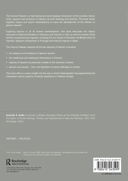 "The Fascism Reader" is a fascinating and wide-ranging introduction to the complex nature, limits, aspects and dynamics of Fascism as both ideology and practice. The book draws together classic and recent interpretations to trace the development of generic fascism. Exploring fascism in all its manifestations, this book discusses notorious examples such as Hitler's Germany, Mussolini's Italy and Franco's Spain, as well as less familiar regimes including Horthy in Hungary, Salazar's dictatorship in Portugal and the British Union of Fascists. It also examines the intellectual and ideological dimensions of fascism and the impact of fascism on society-from anti-Semitism to fascist attitudes to women.