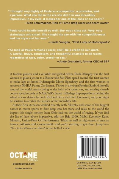 A fearless pioneer and a versatile and gifted driver, Paula Murphy was the first woman to pilot a jet car to a Bonneville Salt Flats speed record, the first woman to make laps at famed Indianapolis Motor Speedway, and the first woman to secure an NHRA Funny Car license. Throw in driving a Pontiac Sunbird literally around the world, nearly dying at the helm of a rocket car, and scoring closed-course speed records at NASCAR's famed Talladega Superspeedway behind the wheel of cars driven by both Richard Petty and Fred Lorenzen, and you might be starting to scratch the surface of her incredible life. Author Erik Arneson worked directly with Murphy and some of the biggest names in motor sports to dive deep into her story and relay to the world the impact this single mother from Ohio had on the world of racing. If you find the list of feats above impressive, add the Baja 1000, Mobil Economy Runs, Monaco, Union/Pure Oil Performance Trials, as well as high-speed stunts on horses, sailboats and a snowmobile and you're starting to get close. Jump in--The Fastest Woman on Wheels is one hell of a ride.