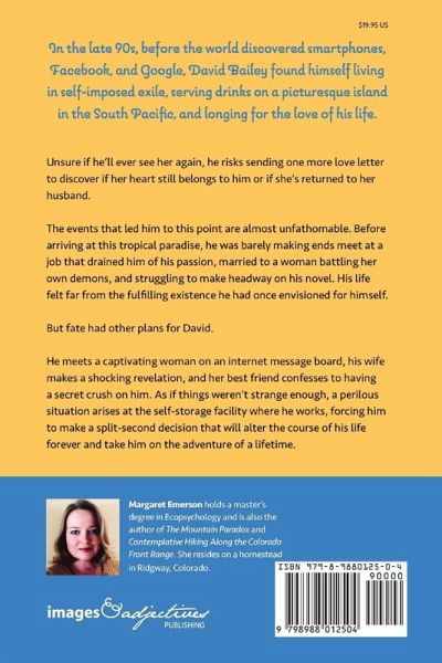 A story about an online affair, a troubled marriage, and the mysterious fate that leads to a life-altering decision. In the late 90s, before the world discovered smartphones, Facebook, and Google, David Bailey found himself living in self-imposed exile, serving drinks on a picturesque island in the South Pacific, and longing for the love of his life. Unsure if he'll ever see her again, he risks sending one more love letter to discover if her heart still belongs to him or if she's returned to her husband. The events that led him to this point are almost unfathomable. Before arriving at this tropical paradise, he was barely making ends meet at a job that drained him of his passion, married to a woman battling her own demons, and struggling to make headway on his novel. His life felt far from the fulfilling existence he had once envisioned for himself. But fate had other plans for David. He meets a captivating woman on an internet message board, his wife makes a shocking revelation, and her best friend confesses to having a secret crush on him. As if things weren't strange enough, a perilous situation arises at the self-storage facility where he works, forcing him to make a split-second decision that will alter the course of his life forever and take him on the adventure of a lifetime.