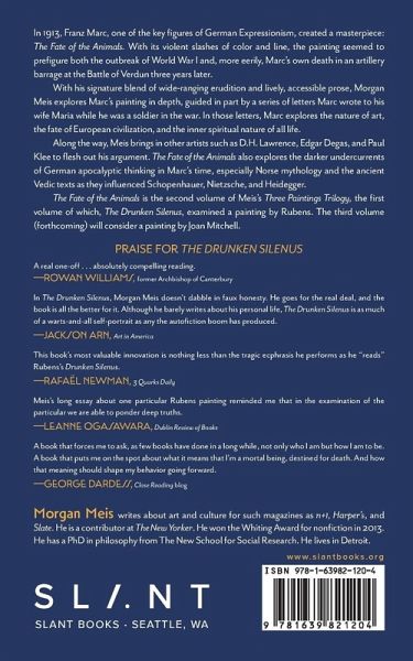 In 1913, Franz Marc, one of the key figures of German Expressionism, created a masterpiece: The Fate of the Animals. With its violent slashes of color and line, the painting seemed to pre-figure both the outbreak of World War I and, more eerily, Marc's own death in an artillery barrage at the Battle of Verdun three years later. With his signature blend of wide-ranging erudition and lively, accessible prose, Morgan Meis explores Marc's painting in depth, guided in part by a series of letters Marc wrote to his wife Maria while he was a soldier in the war. In those letters, Marc explores the nature of art, the fate of European civilization, and the inner spiritual nature of all life. Along the way, Meis brings in other artists such as D.H. Lawrence, Edgar Degas, and Paul Klee to flesh out his argument. The Fate of the Animals also explores the darker undercurrents of German apocalyptic thinking in Marc's time, especially Norse mythology and the ancient Vedic texts as they influenced Schopenhauer, Nietzsche, and Heidegger. The Fate of the Animals is the second volume of Meis's Three Paintings Trilogy, the first volume of which, The Drunken Silenus, examined a painting by Rubens. The third volume (forthcoming) will consider a painting by Joan Mitchell.