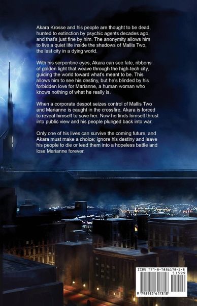 Akara Krosse and his people are thought to be dead, hunted to extinction by psychic agents decades ago, and that's just fine by him. The anonymity allows him to live a quiet life inside the shadows of Mallis Two, the last city in a dying world. With his serpentine eyes, Akara can see fate, ribbons of golden light that weave through the high-tech city, guiding the world toward what's meant to be. This allows him to see his destiny, but he's blinded by his forbidden love for Marianne, a human woman who knows nothing of what he really is. When a corporate despot seizes control of Mallis Two and Marianne is caught in the crossfire, Akara is forced to reveal himself to save her. Now he finds himself thrust into public view and his people plunged back into war. Only one of his lives can survive the coming future, and Akara must make a choice; ignore his destiny and leave his people to die or lead them into a hopeless battle and lose Marianne forever.