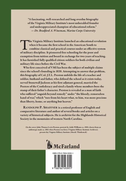 The Virginia Military Institute launched an educational revolution when it became the first school in the American South to combine classical and practical courses under an effective system of military discipline. It pioneered free schooling for the poor and exemption from tuition and board in exchange for two years of teaching. It has furnished fully qualified citizen-soldiers for both civilian and military life since before the Civil War. Who first conceived of VMI has been the subject of multiple claims since the school's founding in 1839. Attempting to answer that problem, this biography of Col. J.T.L. Preston unfolds the life of a teacher and soldier, husband and father, who defined the school as it exists today, served Stonewall Jackson as his first adjutant general, married the Poetess of the Confederacy and sired a family whose members bore the stamp of their father's character. Preston is revealed as a man of faith who suffered "anguish beyond remedy" under "the bloody, remorseless hand of war," which "tore from his heart what, to him, was more precious than liberty, home, or anything but heaven."