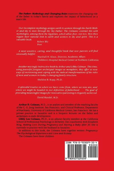 The Father: Mythology and Changing Roles examines the changing role of the father in today's family and explores the impact of fatherhood on a man's life. Our incomplete mythology assigns earth to women through the earth mother and sky to men through the sky father. The colmans contrast this with mythologies, among them the Egyptian, which allow four, not two. Men then regain their natural link to earth and women to sky and spirit. This is a valuable book. -Robert Bly, Poet Table of Contents Introduction: Images of Parents Archetypes of the Father Father the Creator Earth Father Sky Father Royal Father Dyadic Father Images of the Sky Father through the Life Cycle The Early Father-Child Relationship Idealization Coming of Age: Alienation and Ambivalence Reconciliation The Nontraditional Father Men as Earth Parents In the Beginning Earth Fathering Implications for the CHildren Arthur D. Colman, M.D., is an analyst, and member of the leaching faculty of the C.G. Jung Institute of San Francisco, and Clinical Professor, Department of Psychiatry, University of California Medical Center, San Francisco. He has a private practice in Sausalito and is a frequent lecturer on the father and archetypes in male development Libby Lee Colman, Ph.D., Is an adjunct faculty member at the California School of Professional Psychology In Berkeley. She coauthored, With Elisabeth Bing, Making Love During Pregnancy and Having a Baby after 30. She is currently in practice with her husband in Sausalito. In addition to this book, the Colmans have together written Pregnancy, The Psychological Experience and love and Ecstasy.