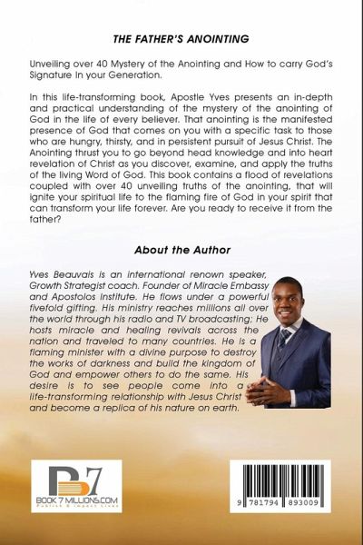 THE FATHER'S ANOINTING Unveiling over 40 Mystery of the Anointing and How to carry God's Signature In your Generation. In this life-transforming book, Apostle Yves presents an in-depth and practical understanding of the mystery of the anointing of God in the life of every believer. That anointing is the manifested presence of God that comes on you with a specific task to those who are hungry, thirsty, and in persistent pursuit of Jesus Christ. The Anointing thrust you to go beyond head knowledge and into heart revelation of Christ as you discover, examine, and apply the truths of the living Word of God. This book contains a flood of revelations coupled with over 40 unveiling truths of the anointing, that will ignite your spiritual life to the flaming fire of God in your spirit that can transform your life forever. Are you ready to receive it from the father?