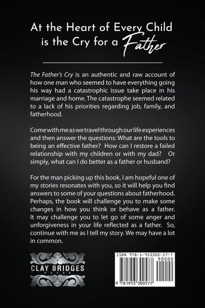 At the Heart of Every Child is the Cry for a Father The Father's Cry is an authentic and raw account of how one man who seemed to have everything going his way had a catastrophic issue take place in his marriage and home. The catastrophe seemed related to a lack of his priorities regarding job, family, and fatherhood. Come with me as we travel through our life experiences and then answer the questions: What are the tools to being an effective father? How can I restore a failed relationship with my children or with my dad? Or simply, what can I do better as a father or husband? For the man picking up this book, I am hopeful one of my stories resonates with you, so it will help you find answers to some of your questions about fatherhood. Perhaps, the book will challenge you to make some changes in how you think or behave as a father. It may challenge you to let go of some anger and unforgiveness in your life reflected as a father. So, continue with me as I tell my story. We may have a lot in common.