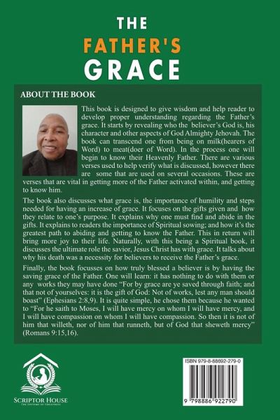 This book is designed to give wisdom and help reader to develop proper understanding regarding the Father's grace. It starts by revealing who the believer's God is, his character and other aspects of God Almighty Jehovah. The book can transcend one from being on milk(hearers of Word) to meat(doer of Word). In the process one will begin to know their Heavenly Father. There are various verses used to help verify what is discussed, however there are some that are used on several occasions. These are verses that are vital in getting more of the Father activated within, and getting to know him. The book also discusses what grace is, the importance of humility and steps needed for having an increase of grace. It focuses on the gifts given and how they relate to one's purpose. It explains why one must find and abide in the gifts. It explains to readers the importance of Spiritual sowing; and how it's the greatest path to abiding and getting to know the Father. This in return will bring more joy to their life. Naturally, with this being a Spiritual book, it discusses the ultimate role the savior, Jesus Christ has with grace. It talks about why his death was a necessity for believers to receive the Father's grace. Finally, the book focusses on how truly blessed a believer is by having the saving grace of the Father. One will learn: it has nothing to do with them or any works they may have done "For by grace are ye saved through faith; and that not of yourselves: it is the gift of God: Not of works, lest any man should boast" (Ephesians 2:8,9). It is quite simple, he chose them because he wanted to "For he saith to Moses, I will have mercy on whom I will have mercy, and I will have compassion on whom I will have compassion. So then it is not of him that willeth, nor of him that runneth, but of God that sheweth mercy" (Romans 9:15,16).