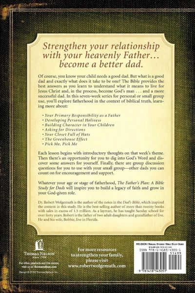 Experience the Father's love and become a better dad. Married and single fathers will benefit from this study that explores the many issues facing dads from a biblical perspective. The Father's Plan: A Bible Study for Dads encourages men at every age and stage of life to strengthen their relationship with God, building a legacy of faith to leave for future generations. This seven-week study helps fathers explore fatherhood in the light of the Bible's teachings. The personal reflection questions will draw fathers into quality personal time with their Heavenly Father, and the group discussion questions will lead dads to reflect on their legacy and to grow in their God-given role.