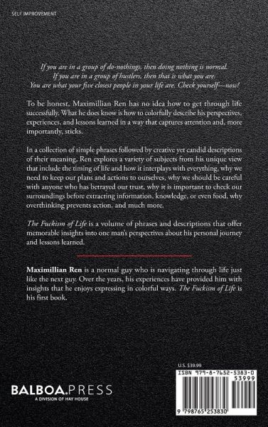 If you are in a group of do-nothings, then doing nothing is normal. If you are in a group of hustlers, then that is what you are. You are what your five closest people in your life are. Check yourself-now! To be honest, Maximillian Ren has no idea how to get through life successfully. What he does know is how to colorfully describe his perspectives, experiences, and lessons learned in a way that captures attention and, more importantly, sticks. In a collection of simple phrases followed by creative yet candid descriptions of their meaning, Ren explores a variety of subjects from his unique view that include the timing of life and how it interplays with everything, why we need to keep our plans and actions to ourselves, why we should be careful with anyone who has betrayed our trust, why it is important to check our surroundings before extracting information, knowledge, or even food, why overthinking prevents action, and much more. The Fuckism of Life is a volume of phrases and descriptions that offer memorable insights into one man's perspectives about his personal journey and lessons learned.